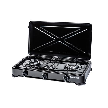 Kuchenka nastawna gazowa Ravanson K-03TB w kolorze czarnym, wyposażona w trzy palniki i metalowy ruszt.