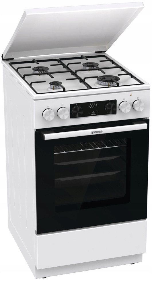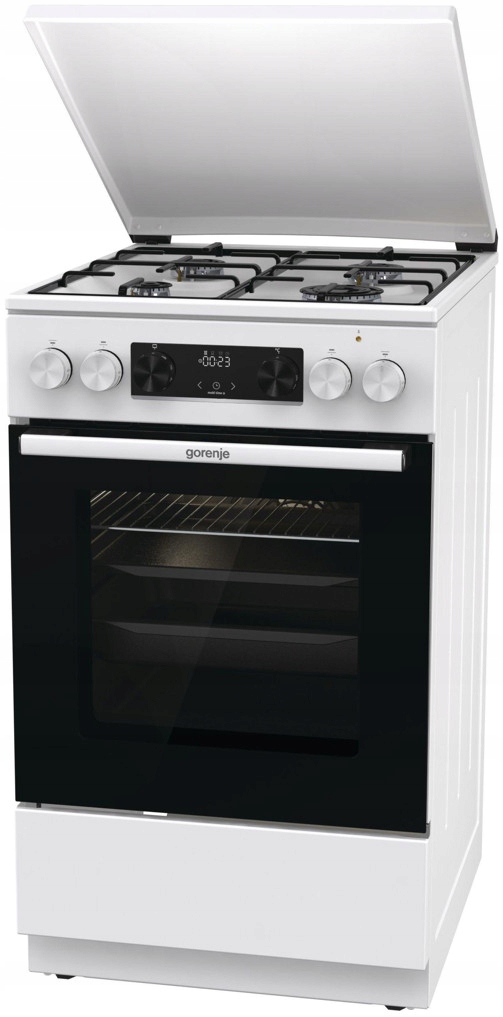 Kuchnia gazowo-elektryczna Gorenje GK5C42WJ to funkcjonalne urządzenie o szerokości 50 cm, wyposażone w piekarnik o pojemności 62 litrów z funkcją AquaClean ułatwiającą czyszczenie. Dzięki timerowi i czterem palnikom gazowym zapewnia wygodę gotowania oraz precyzyjną kontrolę nad procesem pieczenia.