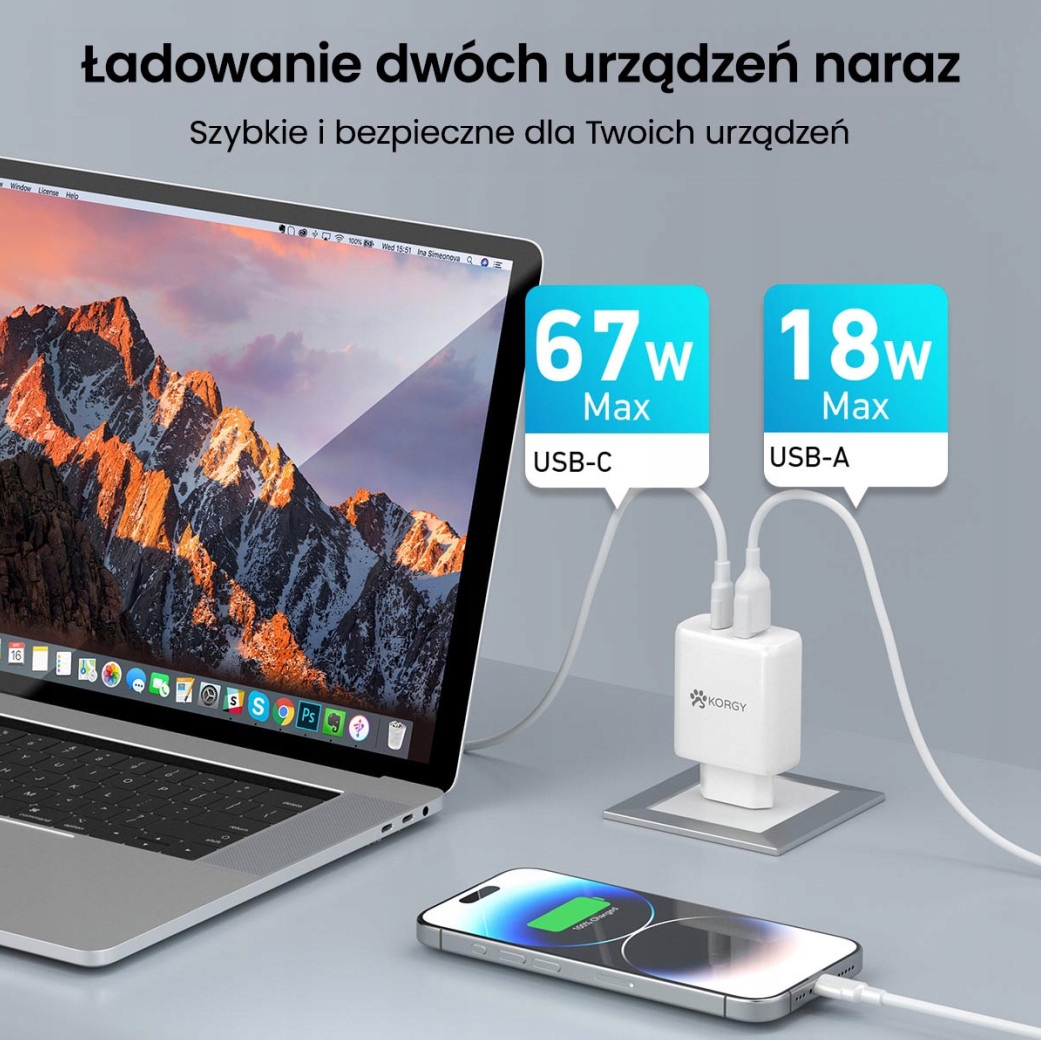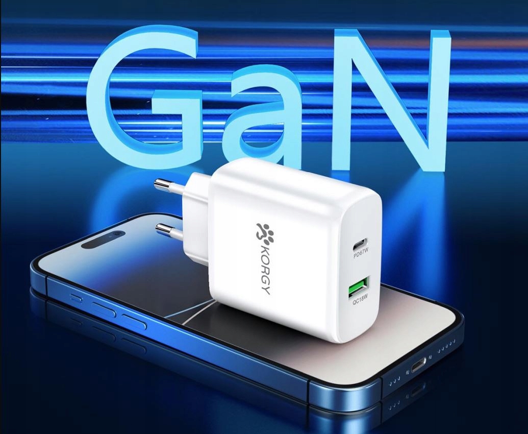 2-portowa szybka ładowarka Korgy K-AC67-AC-B wykorzystuje przełomową technologię azotku galu (GaN), która zapewnia efektywne i bezpieczne ładowanie urządzeń. Dzięki inteligentnemu układowi oraz technologii rozpraszania ciepła, ładowarka szybko i bezpiecznie ładuje urządzenia, zapobiegając przegrzewaniu i przeładowaniu.