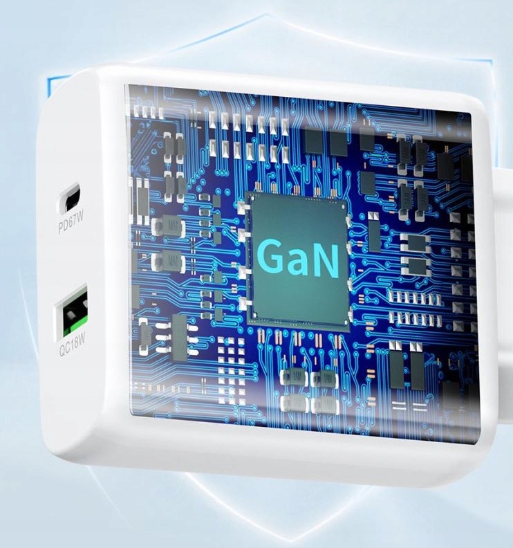Ładowarka GaN dostarcza moc 67W przez port USB-C, a gdy port USB-A działa samodzielnie, zapewnia szybkie ładowanie o mocy 18W.