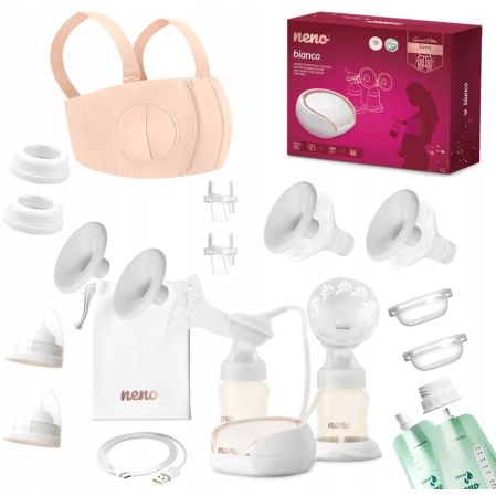 Neno Bianco to kompletny zestaw dla młodej mamy. Zawiera wszystko, czego potrzebujesz: Laktator Neno Bianco • Elegancki woreczek • Kabel USB-C • 2 butelki na mleko • 4 pokrywki lejka • 2 lejki w rozmiarze 21 mm • 2 lejki w rozmiarze 24 mm • 2 podstawki pod butelkę • Silikonową rurkę • 2 nakrętki do butelek • 4 zaworki • 2 smoczki do butelki • 2 woreczki do mrożenia