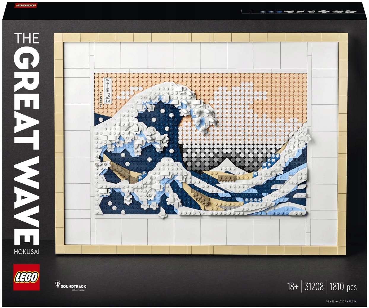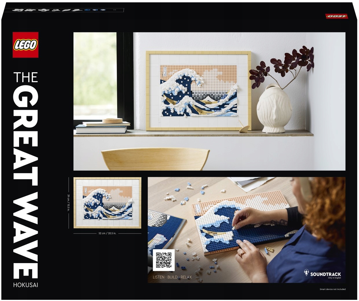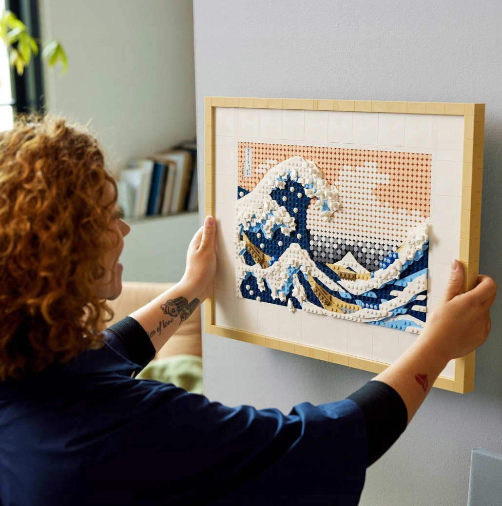- Wspaniała ozdoba – model LEGO® dla dorosłych zawierający 1810 elementów, w tym sześć płytek w formie płótna, dwa wieszaki, rozdzielacz klocków i dekoracyjną płytkę z podpisem Hokusaia