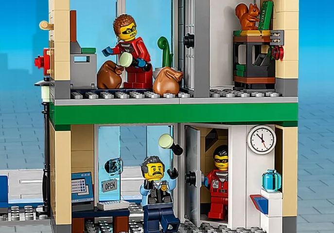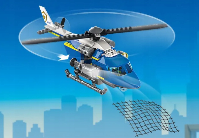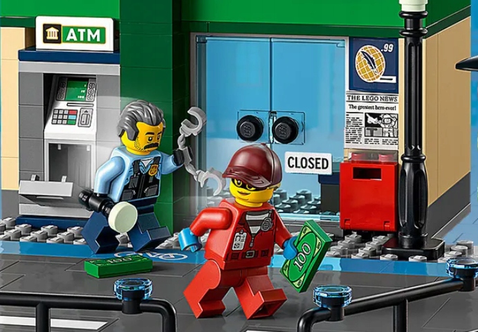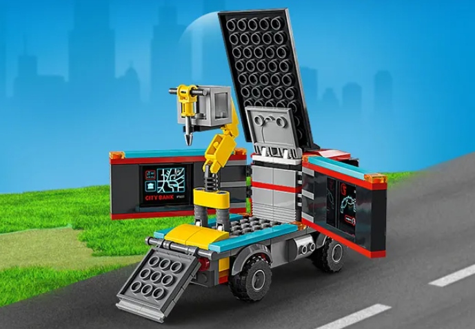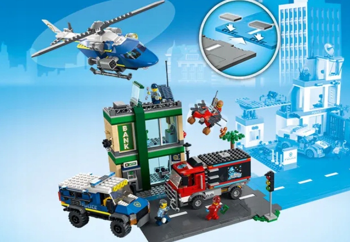 - Zawartość opakowania — w środku jest wszystko, czego dzieci potrzebują do zbudowania wielofunkcyjnego budynku banku, furgonetki złodziejaszków, helikoptera policyjnego i furgonetki policyjnej, oraz sześć minifigurek, w tym pięć postaci z serialu LEGO® City