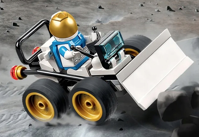- Zawartość opakowania — wszystko, czego dzieci potrzebują do zbudowania stacji badawczej na Księżycu z kopułą oraz pojazdów, takich jak lądownik księżycowy, powietrzny dron dźwigowy, łazik ROVER i łazik księżycowy, a także 6 minifigurek astronautów