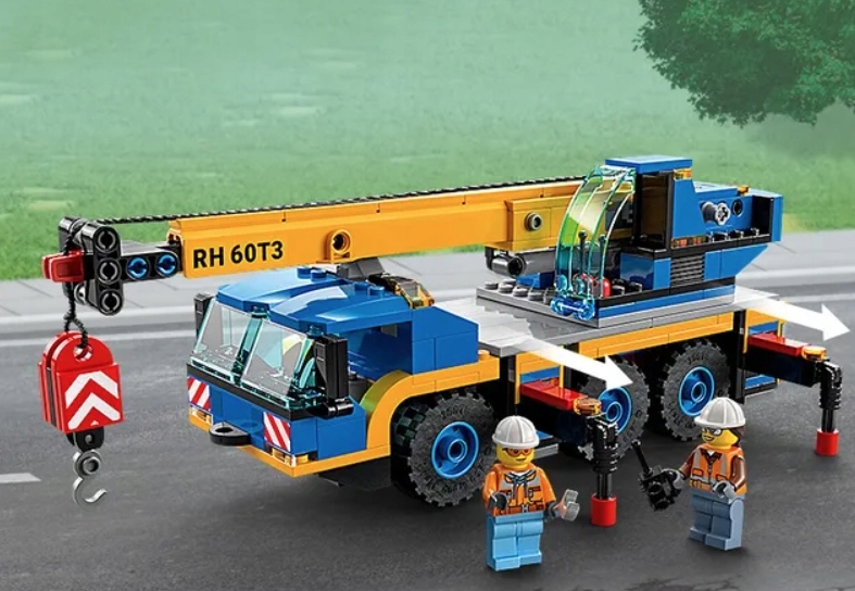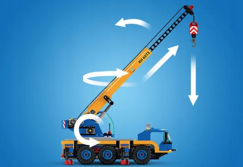 Ten 340-elementowy żuraw ma działający wysięgnik, podpory i wciągarkę oraz zawiera minifigurki kierowcy i robotnika.