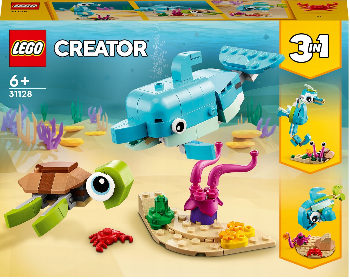 Zestaw trzy w jednym Delfin i żółw (31128) pozwala fanom LEGO® w wieku od sześciu lat zanurkować na dno morza i bawić się z morskimi zwierzętami. Pociechy znajdą tu małego delfina z ruchomym ciałem, płetwami, szczęką i ogonem oraz małego żółwia z ruchomymi płetwami i głową. Oba modele są umieszczone na podstawkach do ekspozycji.