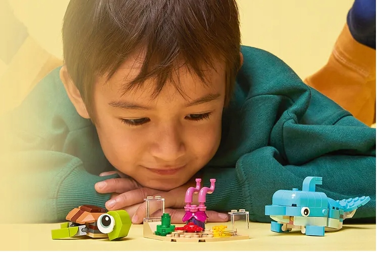 - Nieograniczone możliwości zabawy — fani LEGO® mogą zbudować jedną z trzech podwodnych scenek: dołączyć do delfina i żółwia, popływać z konikiem morskim i ślimakiem lub popluskać się z rybą i krabem