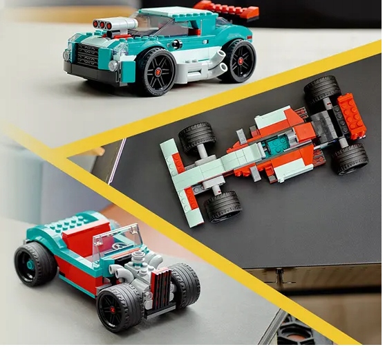 Ten zestaw LEGO® Creator 3 w 1 pozwala dzieciom zbudować trzy różne modele do zabawy. Ulicznego wyścigowego muscle cara można przebudować w samochód wyścigowy lub specjalnego czerwono-turkusowego hot roda. Pociechy mogą też użyć wyobraźni i stworzyć własne szybkie auto o dużej mocy.