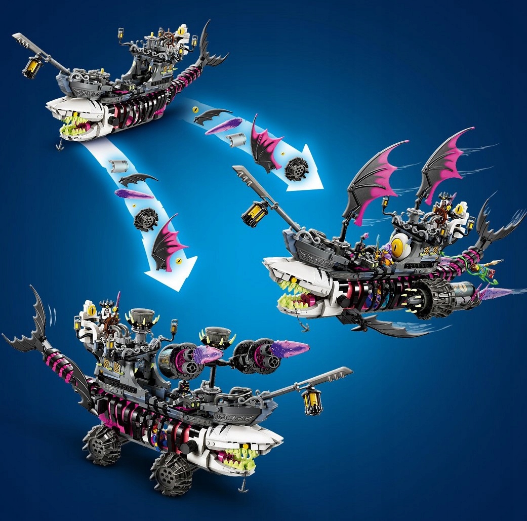 Dzięki zestawowi LEGO® DREAMZzz™ Koszmarny rekinokręt (71469) dzieci w wieku od 10 lat wkroczą do krainy snów. Nocny Łowca schwytał ulubionego pluszaka Izzie i połączył go ze statkiem pirackim, tworząc potworny pojazd, który dzieci mogą teraz zbudować. Jeden pojazd do zbudowania na dwa sposoby Dzieci mogą zbudować pojazd na dwa sposoby — w trybie statku lub w trybie czołgu. Tryb statku ma potężne silniki i żagle, a tryb czołgu ma fajne akcesoria i latające gałki oczne. Dwie opcje budowania zachęcają do kreatywności i zapewniają jeszcze fajniejszą zabawę Ciekawe funkcje Rekinokręt jest pełen fajnych funkcji, które zachwycą dzieci. Można otworzyć szczękę i umieścić w niej minifigurkę, nacisnąć przycisk, aby odkryć sekretną skrzynię ze skarbami, zdjąć tylną kabinę i nie tylko. Pojazd jest również wyposażony w wieżyczki po obu stronach, które mogą się obracać i strzelać, a pośrodku znajduje się klatka i zapadnia.