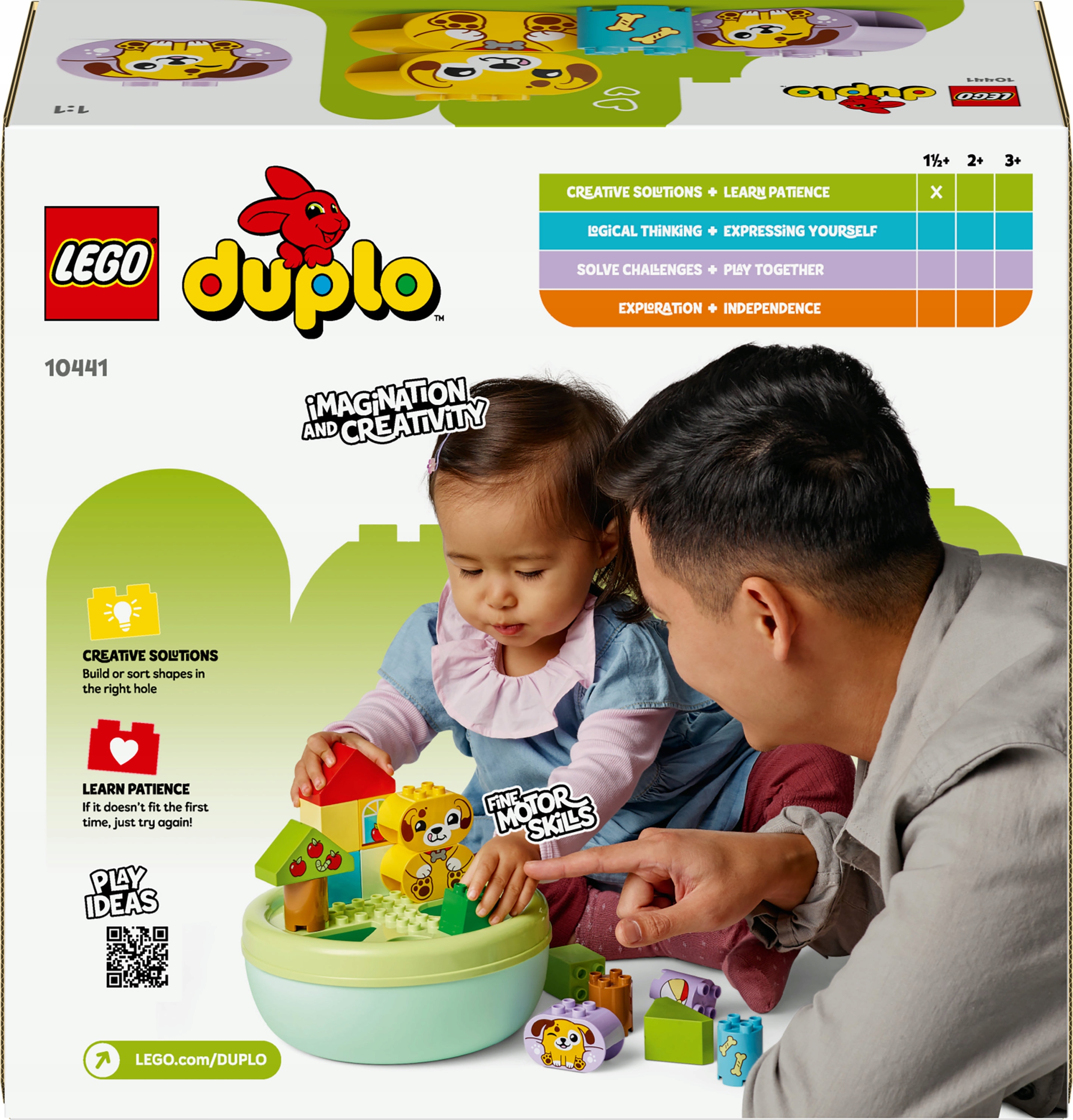 Ta zabawka wspierająca rozwój myślenia przestrzennego oferuje edukacyjną zabawę dla całej rodziny. Rodzice mogą wskazywa ć różne kształty w zestawie, a maluchy używać ich do budowania drzew, figurek psów, a nawet domu. Następnie mogą cieszyć się kreatywną zabawą w odgrywanie ról z uroczymi pieskami LEGO® DUPLO®, rzucanie im piłki czy karmienie kością.