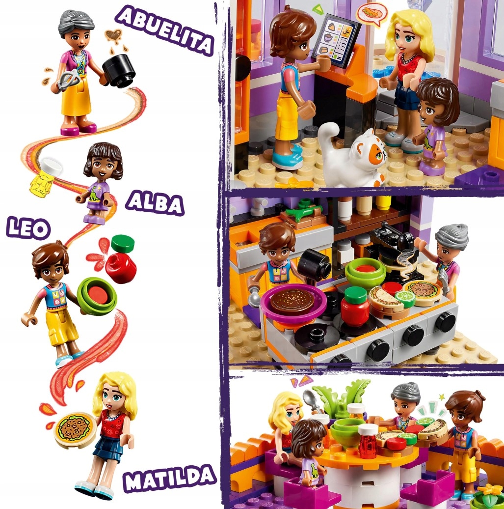 - 5 postaci i akcesoria — w zestawie znajdują się postacie LEGO® Friends: Leo, Alba, Abuelita, kot Churro i klientka o imieniu Matylda, a także mnóstwo akcesoriów do odgrywania ról
