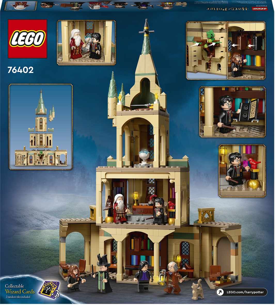Kilkupiętrowy model z Hogwartem ma kilka miejsc z wiernie odwzorowanymi detalami z popularnych filmów, które zainspirują dzieci do pomysłowej zabawy. W zestawie jest sześć minifigurek: Harry Potter, Hermiona Granger™, Albus Dumbledore™, Severus Snape™, Argus Filch i madame Pince. Są tu również znane przedmioty, takie jak peleryna-niewidka Harry’ego, Myślodsiewnia do przechowywania wspomnień, legendarny Miecz Gryffindora, słynna Tiara Przydziału oraz młody Fawkes rodzący się z popiołów. W bezpłatnej aplikacji Instrukcje budowania LEGO dzieci mogą wyświetlać, powiększać i obracać powstający model, co wzbogaca zabawę w budowanie o wciągający element interaktywności. Zestaw jest też modułowy i można połączyć go z innymi modelami z serii, by zbudować cały zamek Hogwart.