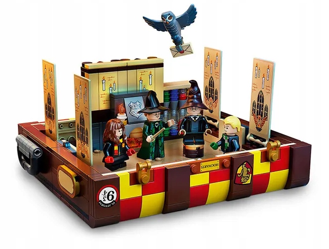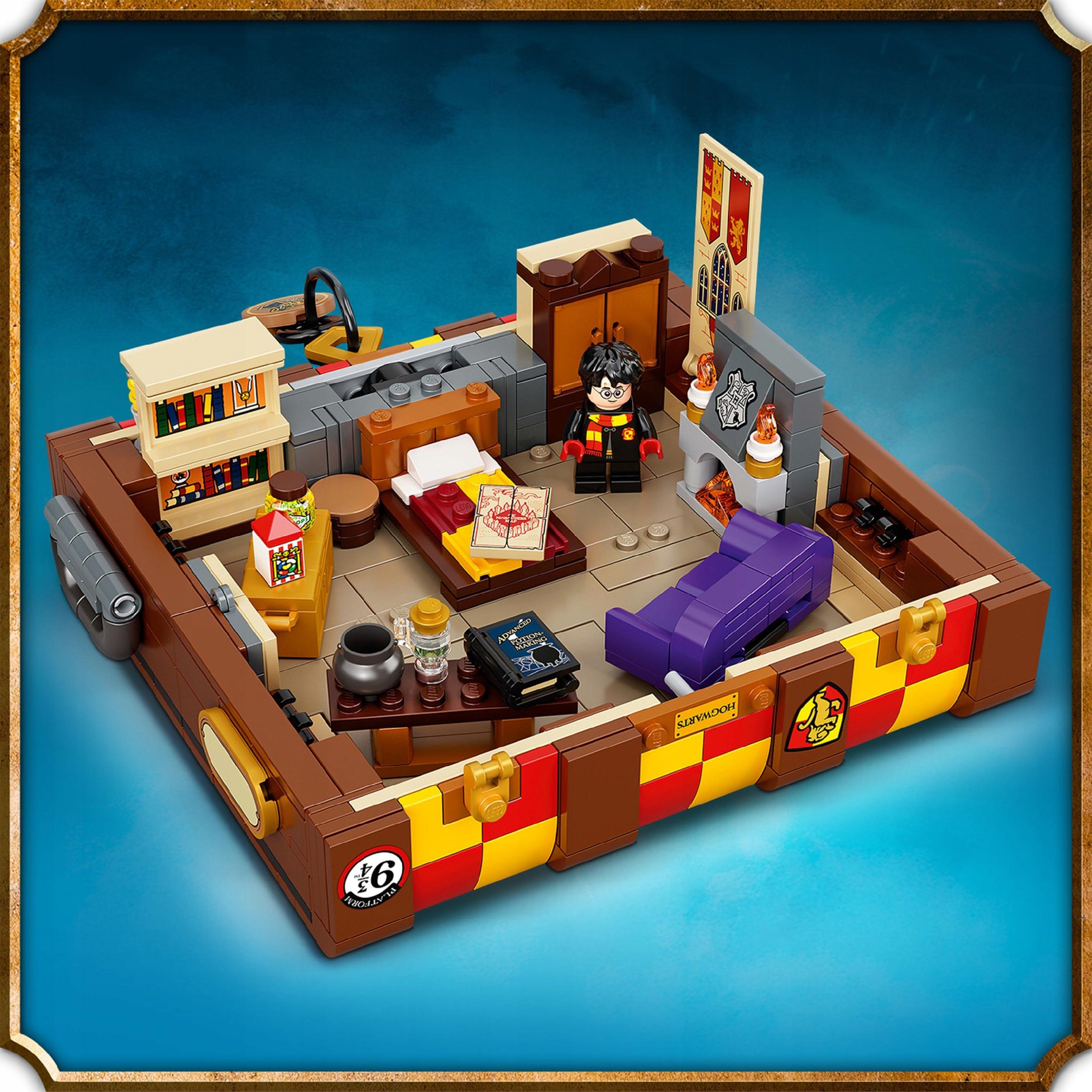 Dzieci mogą ozdobić swoje kufry z klocków LEGO kolorami wybranego domu z Hogwartu i wesołymi naklejkami, dzięki czemu każdy model wygląda jak prawdziwy kufer ucznia magicznej szkoły. W środku modelu jest dużo różnych części do budowania minifigurek, w tym różne włosy i kolory skóry, więc dzieci mogą zbudować nawet pięć postaci z filmów o Harrym Potterze i zaprojektować własnych uczniów magii. Do tego szeroka gama mebli i akcesoriów z filmów podsuwa pomysły i inspiruje do zabawy w twórcze przygody w Hogwarcie. Za pomocą tego zestawu dzieci mogą odegrać trzy klasyczne sceny z filmów: ceremonię przydziału, ucztę w Wielkiej Sali oraz odpoczynek w pokoju wspólnym. Po zakończonej zabawie wszystkie części można schować do kufra, więc dzieci mogą mieć magię Hogwartu zawsze przy sobie.