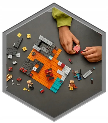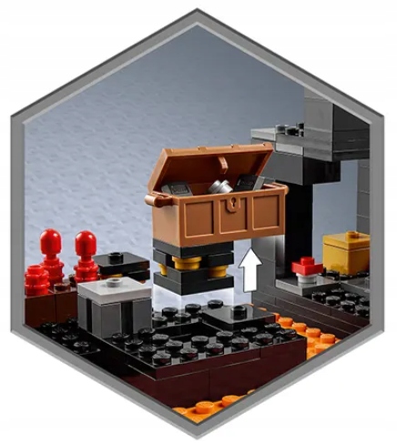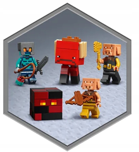 W trakcie podróży do bastionu w ognistym Netherze gracze będą walczyć z przeciwnikami i zmierzą się z licznymi wyzwaniami, po drodze zbierając przedmioty zachęcające do jeszcze lepszej kreatywnej zabawy. Wśród znanych z Minecrafta postaci znajdują się poszukiwacz przygód z Netheru, kostka magmy, piglin okrutnik, piglin i magmołaz. Zestaw ma kilka specjalnych funkcji, takich jak funkcja wybuchu aktywowana przez umieszczenie bloku TNT w odpowiednim miejscu i naciśnięcie przycisku. Dzieci rozpoznają tu też znane z gry akcesoria, m.in. karmazynowy korzeń, spaczony grzyb, złocony czernit, netherową brodawkę, czerwone grzyby, eteryczne pochodnie, bloki złota, netherowe złoże złota, eteryczny ogień oraz broń — złoty topór, kuszę i netherytowy miecz. W zestawie są również blok TNT, wędka i skrzynia skarbów zawierająca odłamki netherytu, bryłki złota i schab. Zestaw można przebudowywać, aby przeżywać nowe, nieograniczone przygody — zupełnie jak w Minecrafcie.