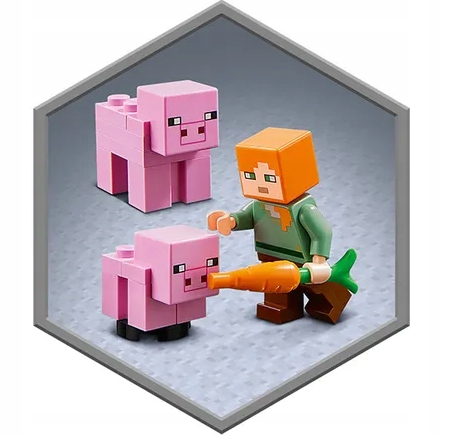 Wykorzystując swoje umiejętności, dzieci mogą stworzyć zabawny model domu w kształcie ogromnej świni — zupełnie tak jak w grze. Bok modelu można otworzyć, by wejść do dużego pokoju, a na głowie świni jest zdejmowany dach, pod którym kryje się jeszcze więcej miejsca do zabawy. Model można przekształcać bez końca, a głowa świni jest odczepiana, więc da się ją przenieść w dowolne miejsce. Odważna bohaterka Alex zaprasza do wspólnej zabawy, ale gracze muszą uważać na znanego i (nie)lubianego Creepera™, który ma zamiar pokrzyżować wszystkie plany. Przed domem też jest wiele do roboty — na konstruktorów czekają dwie urocze świnki. Ponadtomodel ma funkcję eksplozji, która nadaje mu realizmu. Skorzystaj z niej, a dom rozpadnie się na kawałki!