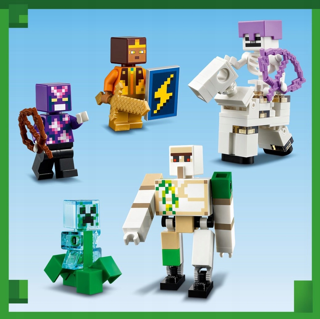 - Mnóstwo figurek i mobów — zestaw zawiera kryształowego rycerza, złotego rycerza, żelaznego golema, naładowanego Creepera™ i dwóch szkieletowych jeźdźców, a także funkcjonalne elementy zewnętrzne i wewnętrzne z wieloma akcesoriami
