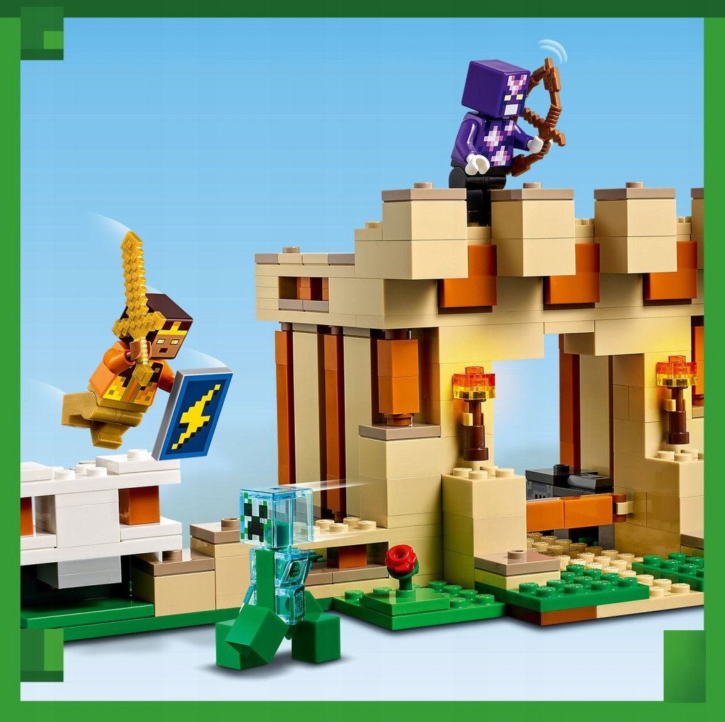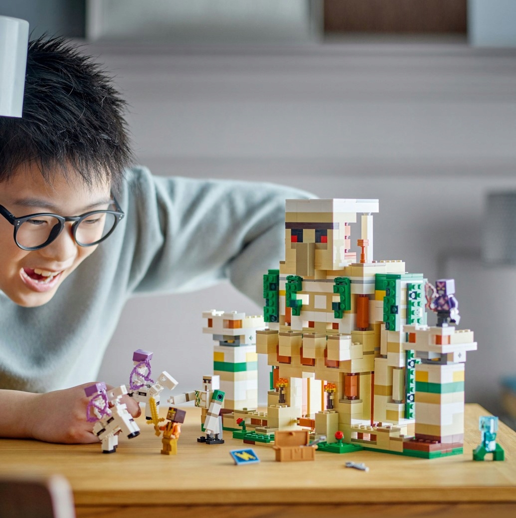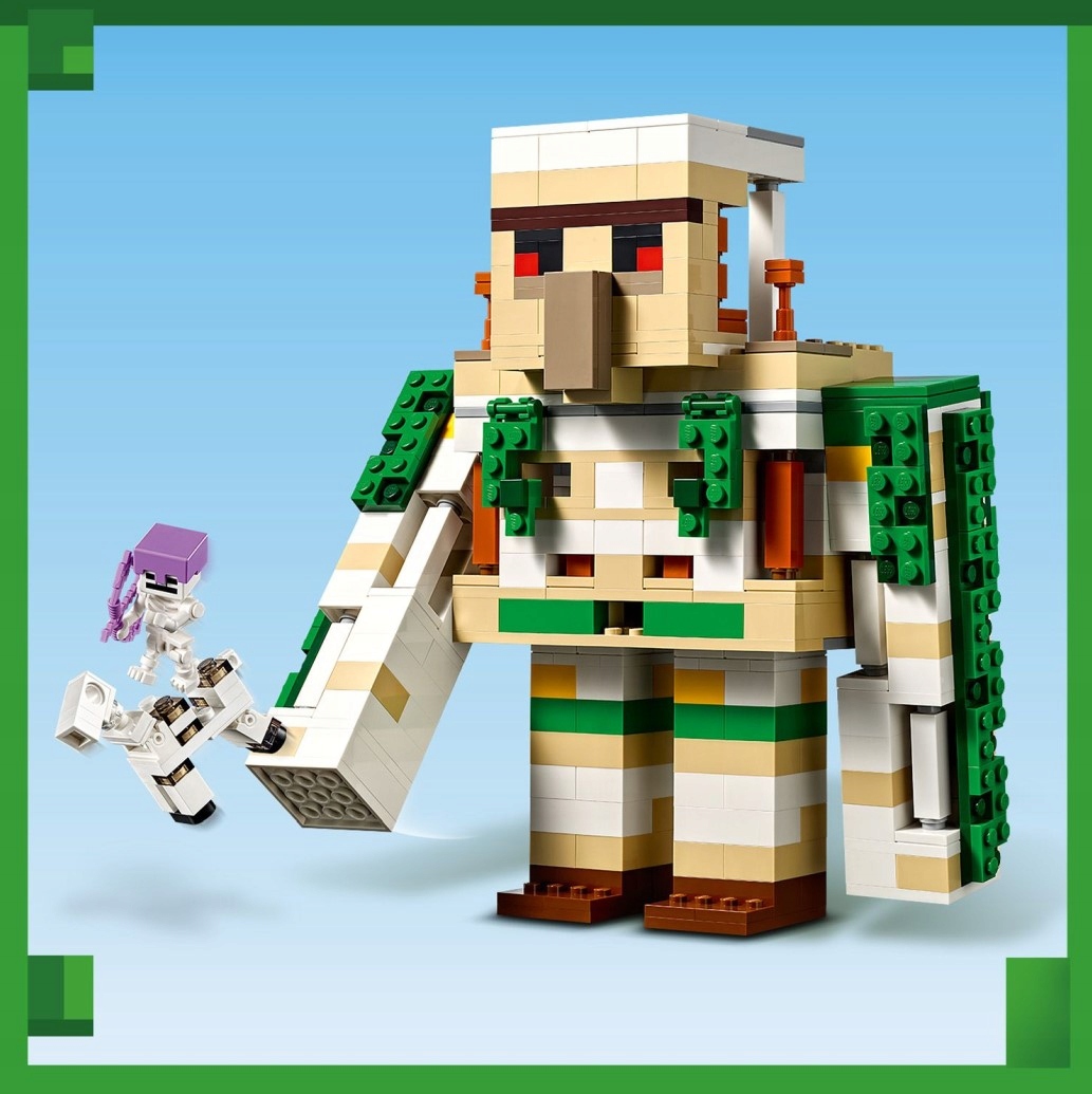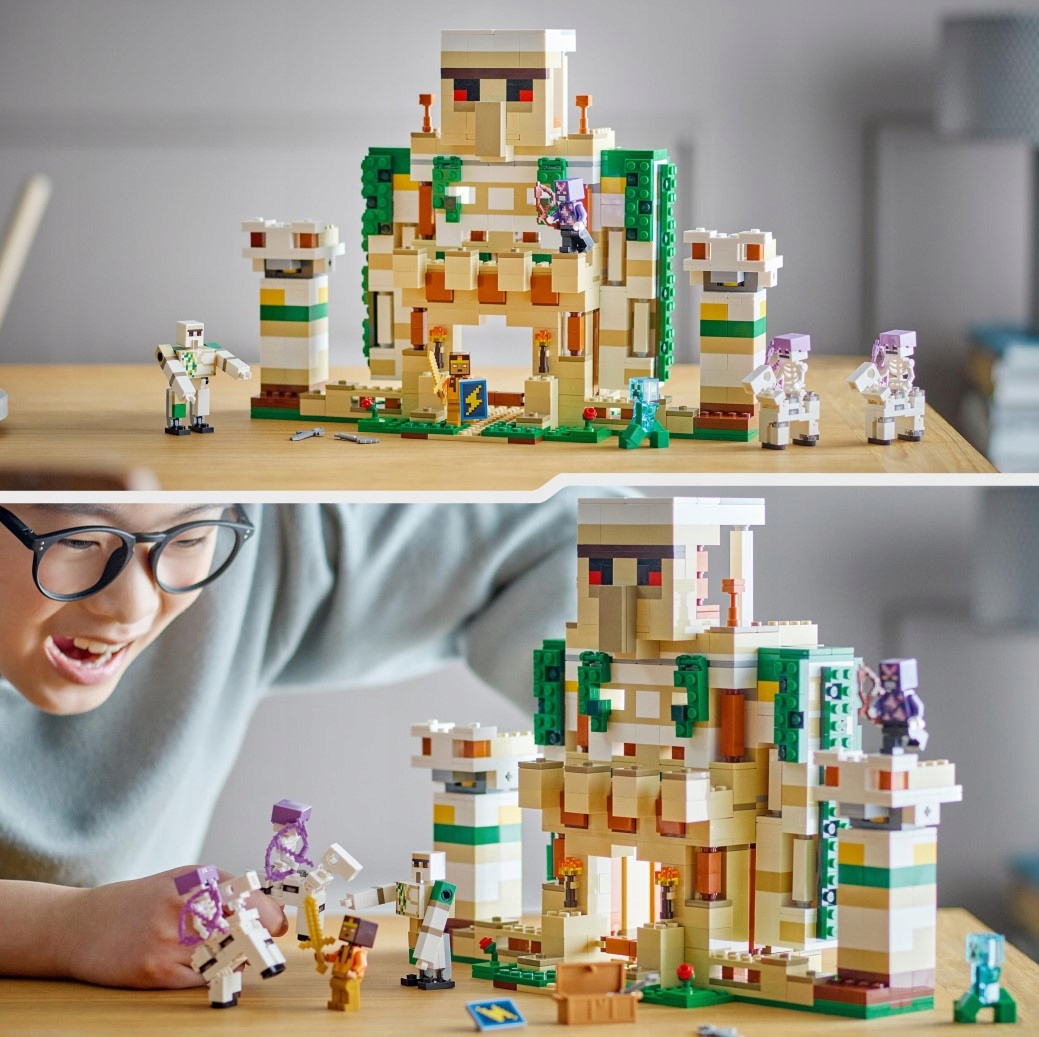 Ten niezwykły zestaw oferuje dzieciom dwa różne scenariusze zabawy. Pierwszy to twierdza golema, w której znajduje się dwóch bohaterów z gry – kryształowy rycerz i złoty rycerz, którzy chronią swoją bazę przed wrogimi napastnikami – naładowanym Creeperem™ i dwoma szkieletowymi jeźdźcami. Aby zabawa była jeszcze fajniejsza, dzieci mogą zmienić fortecę w potężną figurkę golema z ogromnymi ruchomymi rękami. Dzięki wielu znanym funkcjom i akcesoriom z Minecrafta możliwości zabawy są nieograniczone. Dodatkową, cyfrową zabawę zapewnia intuicyjna aplikacja LEGO Builder, w której konstruktorzy mogą powiększać i obracać zestawy w 3D oraz śledzić swoje postępy.