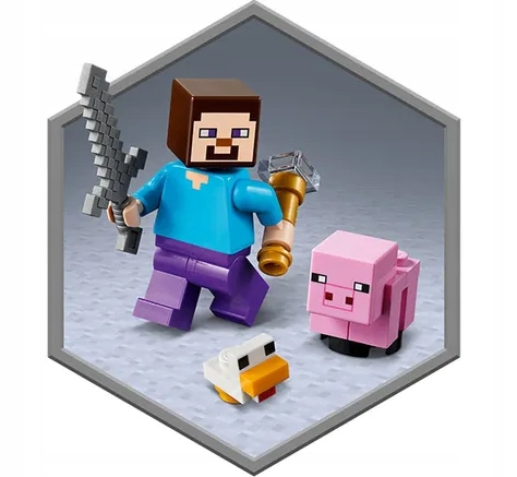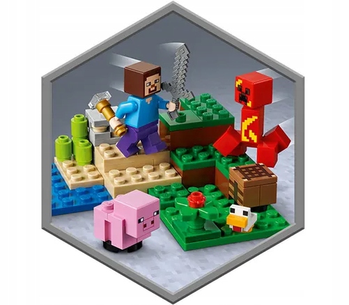 W tym niewielkim, klasycznym zestawie z serii Minecraft znajdzie się sporo atrakcji dla dzieci. Jeden z bohaterów gry, Steve, spędza czas ze świnką i małym kurczakiem — gdy nagle zjawia się wybuchający Creeper! Najpierw jednak dzieci mogą zbudować coś kreatywnegoz bloków żelaza na stole rzemieślniczym, zająć się zwierzętami i uprawą trzciny cukrowej albo udekorować model makami. Potem mogą wziąć miecz i stanąć do walki ze straszliwym wybuchającym Creeperem. Walka skończy się po naciśnięciu bloku detonacji: Creeper wyleci wtedy w powietrze! Po zakończonej zabawie ten emocjonujący zestaw będzie fajną ozdobą dziecięcego pokoju.