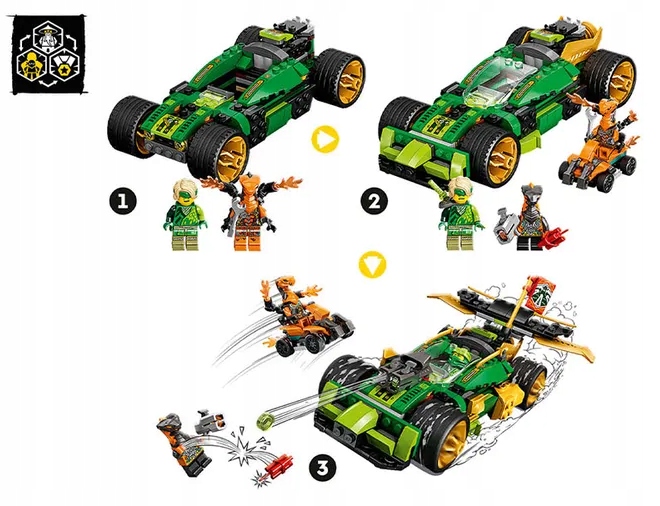 Fani LEGO® w wieku od sześciu lat mogą przez wiele godzin odgrywać ekscytujące i wciągające historie ninja dzięki imponującemu zestawowi Samochód wyścigowy Lloyda EVO (71763). Budowa pojazdu składa się z trzech etapów, w ramach których pociechy tworzą łazik, a na końcu ulepszają go w opancerzony samochód ninja z miotaczami, spojlerami wyposażonymi w ostrza oraz złotymi panelami.