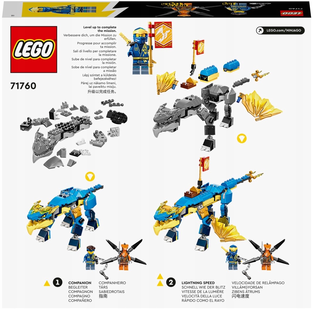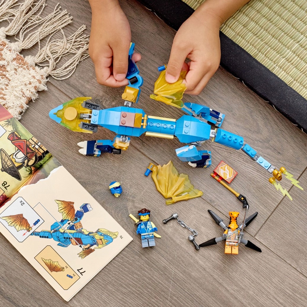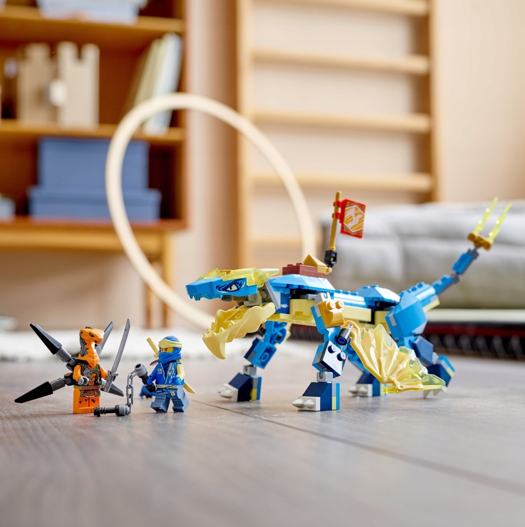 Młodzi wojownicy ninja w wieku od sześciu lat będą się świetnie bawić, wymyślając własne zabawne historie z zestawem Smok gromu Jaya EVO (71760). Smok ma ruchome przednie i tylne łapy, szczękę, głowę i przypominający broń ogon. Można go także ulepszyć, dając mu większe skrzydła.