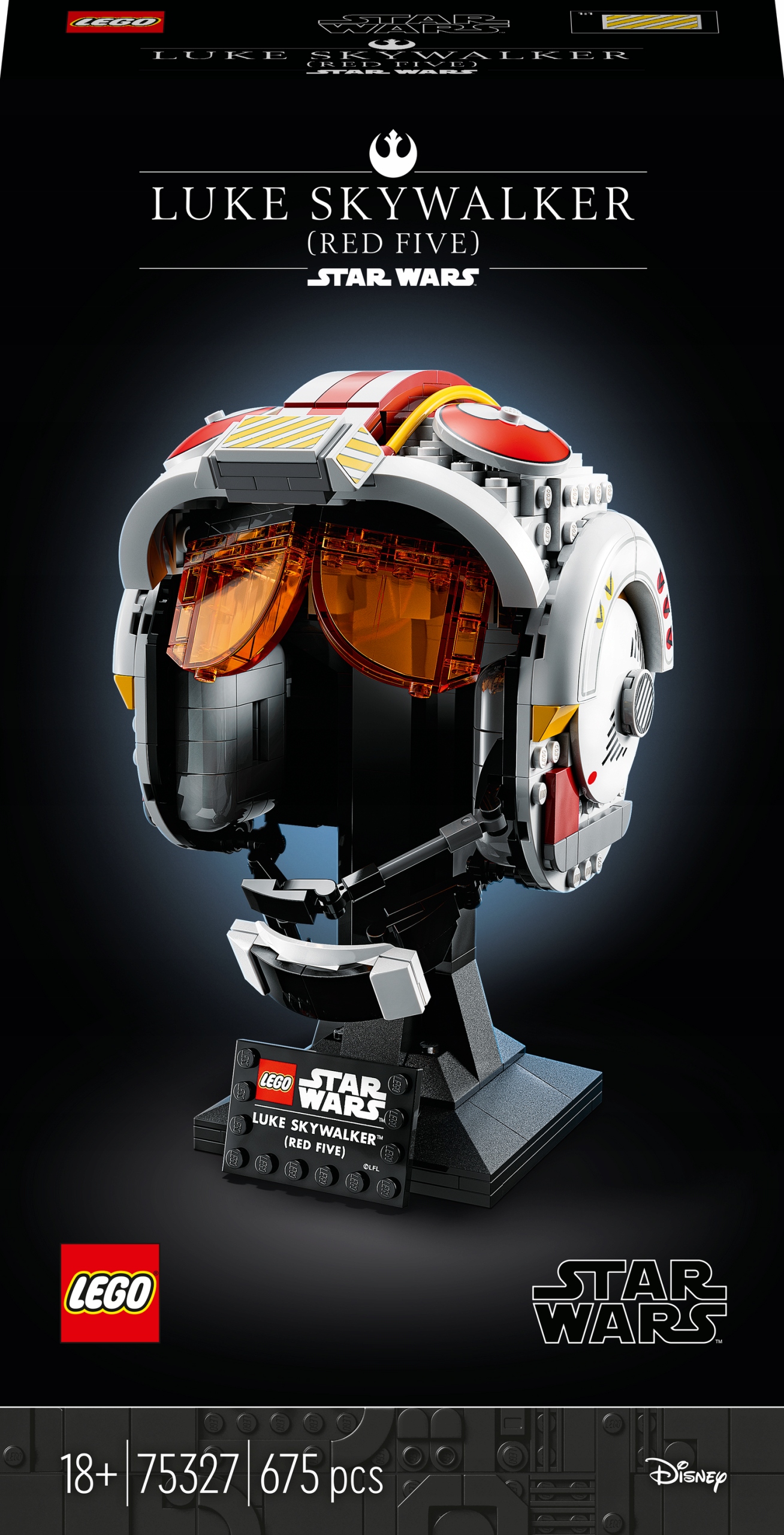 Hełm Luke’a Skywalkera™ (Red Five) z 675 klocków ma wbudowaną podstawkę do ekspozycji i mierzy ok. 19 cm wysokości.