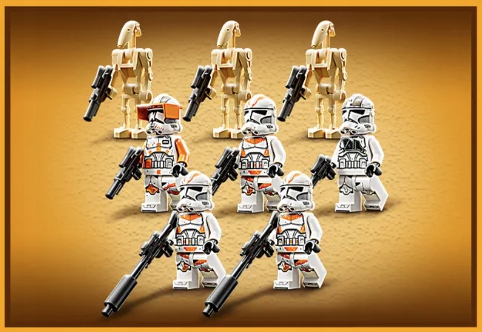 Zestaw obejmuje pięć minifigurek LEGO — komandora Cody’ego, kanoniera i trzech klonów z 212. batalionu, którzy walczą przeciwko trzem figurkom droidów bojowych i minidroidowi pająkowi. Całość uzupełniają fajne bronie. W pudełku i w aplikacji LEGO Instrukcje budowania znajdują się instrukcje, w tym interaktywny podgląd, który urozmaica kreatywne budowanie.