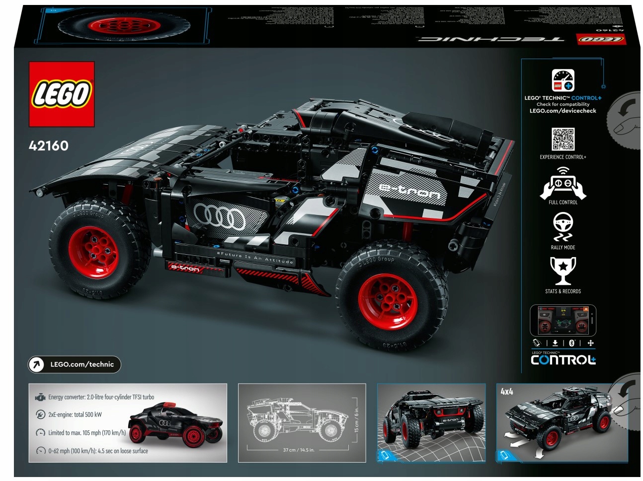 Dzieci, które uwielbiają samochody rajdowe, mogą sprawdzić swoje umiejętności, budując ten model LEGO® Technic Audi RS Q e-tron (42160). Budując, mogą poznać realistyczny samochód elektryczny, który Audi zbudowało, aby poruszać się w trudnych pustynnych warunkach Rajdu Dakar. Ten model zawiera wiele realistycznych detali, takich jak indywidualne zawieszenie każdego z czterech kół. Pojazd zawiera również nowy element koła Technic stworzony specjalnie dla tego modelu, aby odzwierciedlić pełnowymiarowe koła Audi.