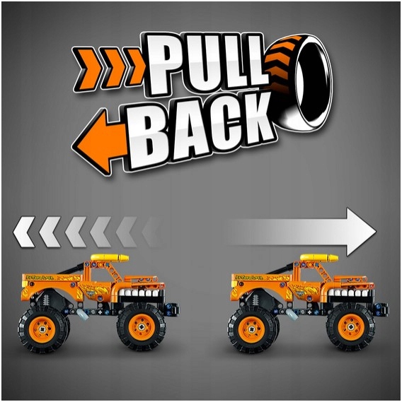 - Świetny model dla fanów monster trucków — dzieciom spodoba się budowanie zestawu 2 w 1 LEGO® Technic Monster Jam™ El Toro Loco™ (42135) i wspaniała zabawa modelami z napędem typu pull-back