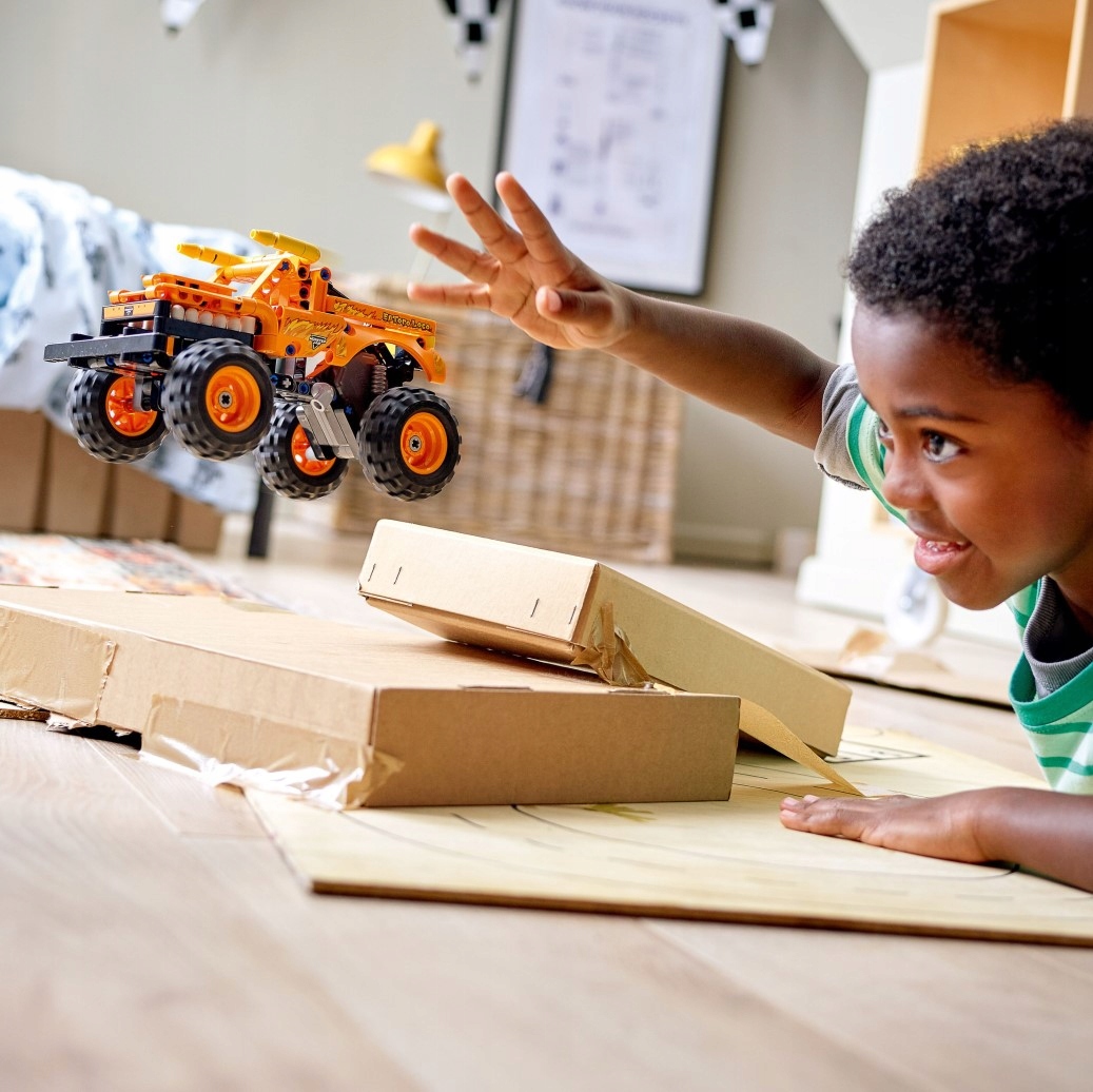 El Toro Loco™ z zestawu 42135 to jeden z najbardziej znanych monster trucków z pokazów Monster Jam™. Teraz siedmiolatki i starsze dzieci mogą zbudować swojego ulubieńca z klocków LEGO® z tego emocjonującego zestawu konstrukcyjnego. Fani słynnej maszyny od razu zauważą rogi, kółko nosowe, zęby i ogniste grafiki — takie jak na pierwowzorze. Dzieci mogą zbudować własne rampy i wykonywać ciekawe sztuczki lub przesunąć auto do tyłu, by dzięki napędowi typu pull-back ruszyło przed siebie.