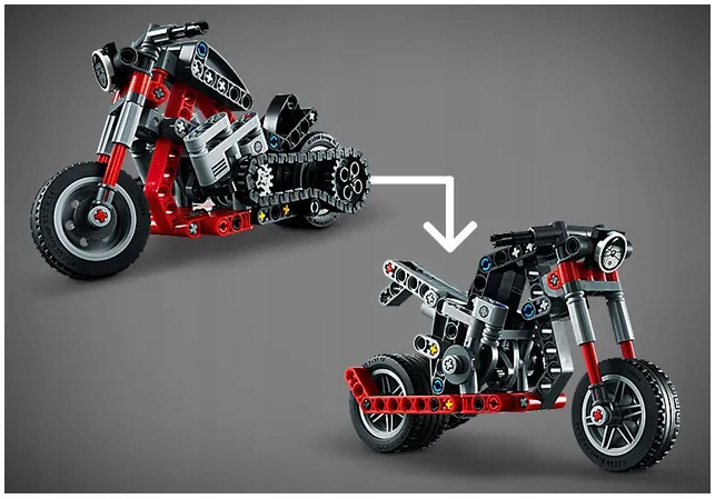 Znasz młodego fana motocykli? Podaruj mu zestaw 2 w 1 LEGO® Technic Motocykl, z którego można zbudować dwa różne pojazdy. Siedmiolatkom i starszym dzieciom spodoba się budowanie realistycznego modelu motocykla. Podczas składania konstrukcji poznają działanie różnych realistycznych funkcji: trzycylindrowego silnika napędzanego łańcuchem, ruchomych tłoków, obracającego się łańcucha i układu kierowniczego.