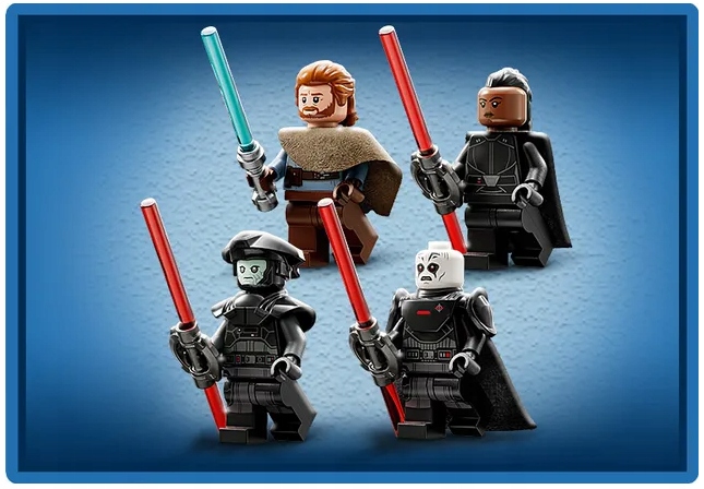 - Cztery minifigurki LEGO® Star Wars™ – minifigurki Bena Kenobiego z niebieskim mieczem świetlnym i Wielki Inkwizytor, Reva (Trzecia Siostra) oraz Piąty Brat z czerwonymi, podwójnymi mieczami świetlnymi