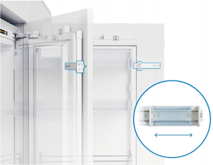 Zawiasy ślizgowe, które łączą zewnętrzne i wewnętrzne drzwi lodówki do zabudowy, zapewniają łatwy montaż i doskonały wygląd kuchni bez szczelin.