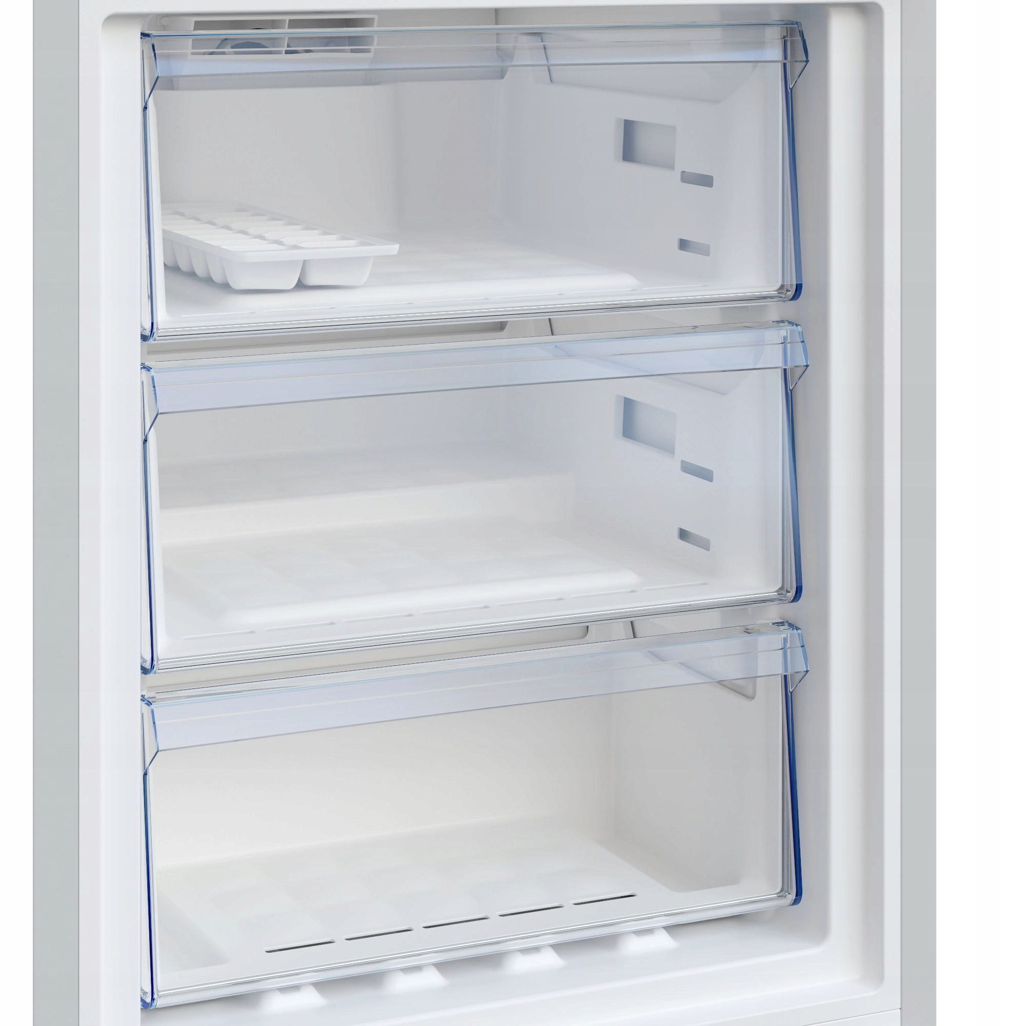 Odkryj lodówkę Beko B5RCNA345HXB2 w eleganckim srebrno-szarym kolorze, która łączy zaawansowaną technologię z praktycznym designem. Dzięki systemowi No Frost zapomnisz o uciążliwym rozmrażaniu, a Twoja żywność dłużej zachowa świeżość i wartości odżywcze. Ta pojemna lodówka o wysokości 179,6 cm i całkowitej pojemności netto 301 L (chłodziarka 209 L, zamrażarka 92 L) idealnie sprawdzi się w każdej rodzinie, oferując mnóstwo miejsca do przechowywania.