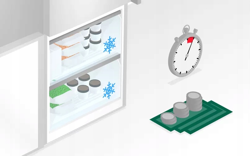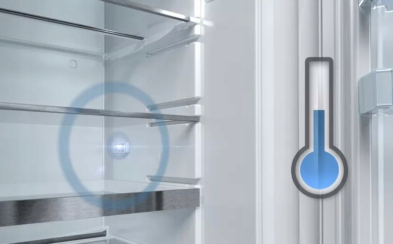 Dzięki optymalnym warunkom przechowywania żywność zachowuje idealną konsystencję — na przykład lody nie będą już zbyt twarde ani zbyt miękkie. Stała temperatura wewnątrz chłodziarki ma decydujące znaczenie dla zachowania świeżości i smaku produktów. Czujniki FreshSense stale monitorują lub regulują temperaturę na zewnątrz oraz wewnątrz chłodziarki i zamrażarki. W rezultacie temperatura wewnątrz chłodziarki jest utrzymywana na stałym poziomie, niezależnie od temperatury zewnętrznej.