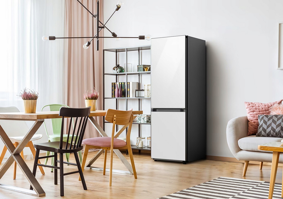 Elegancka lodówka Samsung BESPOKE w kolorze alabastrowej bieli. Dzięki technologii SpaceMax™ oferuje aż 390 litrów pojemności przy standardowych wymiarach. Wysoka na 203 cm, zapewnia doskonałą organizację i świeżość produktów. Personalizuj jej wygląd, wymieniając panele drzwiowe. Cicha praca i nowoczesny design.