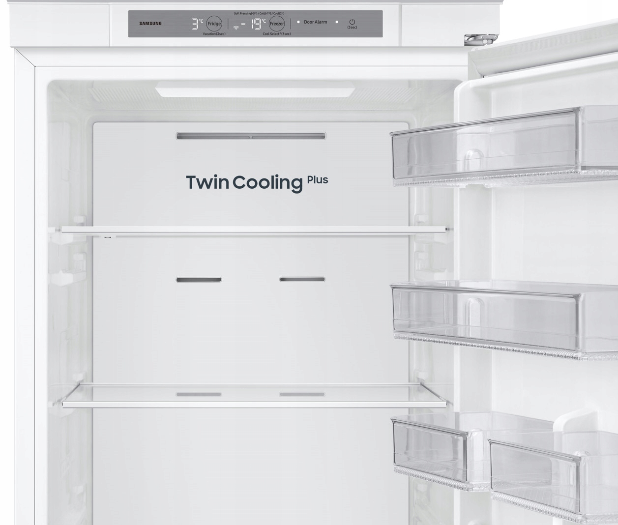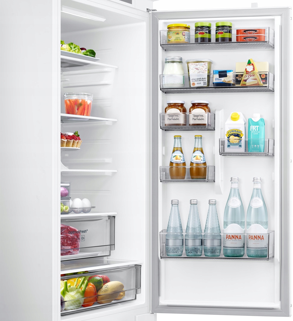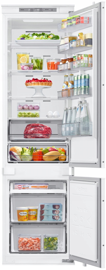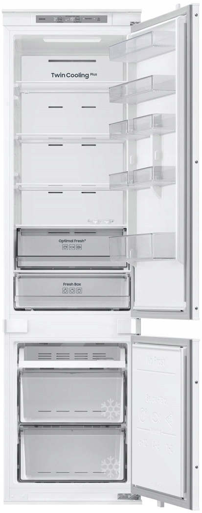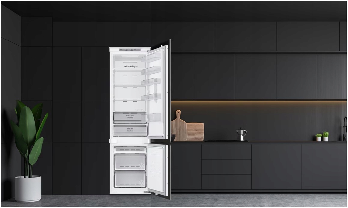 Lodówka Samsung BRB70F30BES0EO o pojemności 298 litrów to nowoczesne urządzenie do zabudowy, które dzięki technologii NoFrost eliminuje konieczność rozmrażania. System Twin Cooling Plus zapewnia niezależne chłodzenie chłodziarki i zamrażarki, co pozwala na dłuższe zachowanie świeżości produktów. Kompaktowa szerokość 54 cm sprawia, że lodówka idealnie wpasowuje się w mniejsze przestrzenie kuchenne, oferując jednocześnie wysoką funkcjonalność.