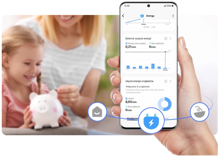 Zarządzaj zużyciem energii, aby obniżyć rachunki za prąd. SmartThings Energy* dostarcza wskazówek dotyczących efektywności energetycznej. Monitoruje również zużycie energii przez urządzenia** w czasie rzeczywistym i porównuje je z poprzednim miesiącem. Dodatkowo powiadamia Cię, jeśli Twoje miesięczne cele mogą zostać przekroczone.