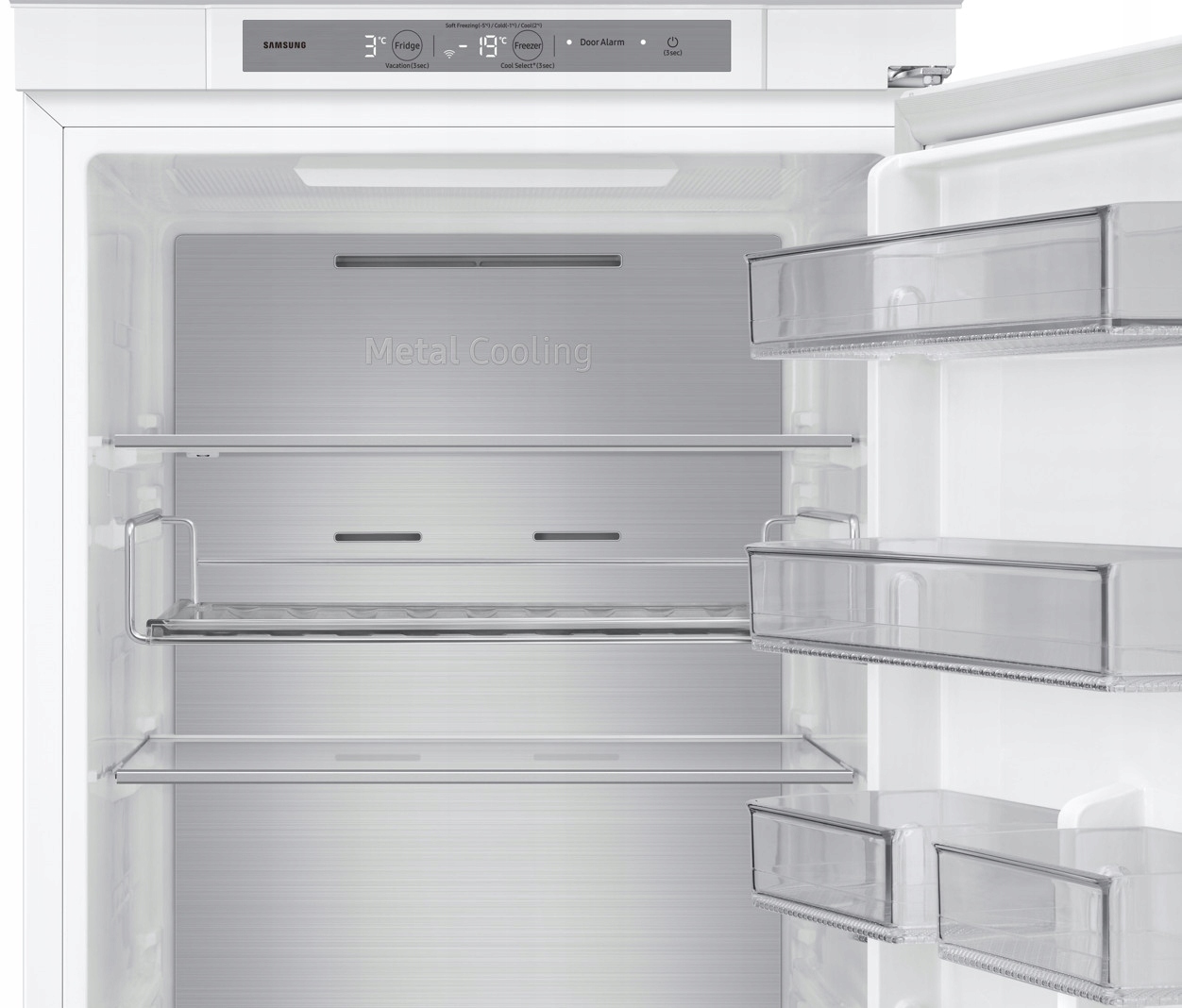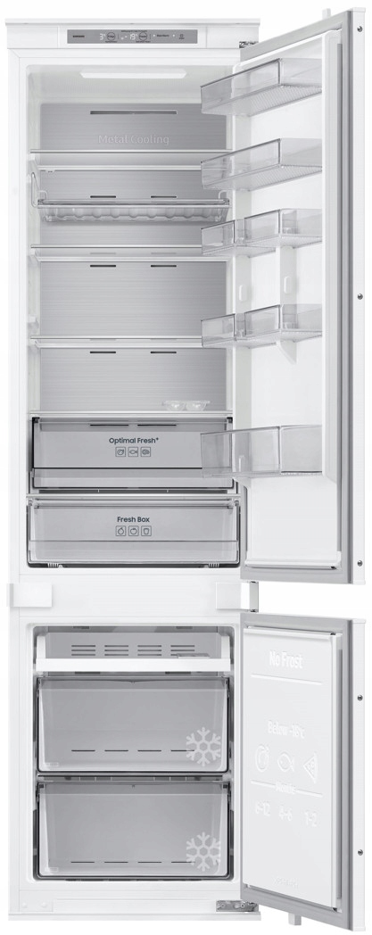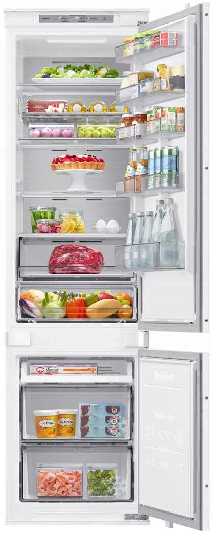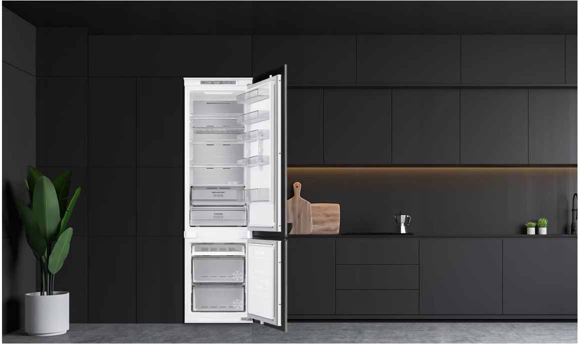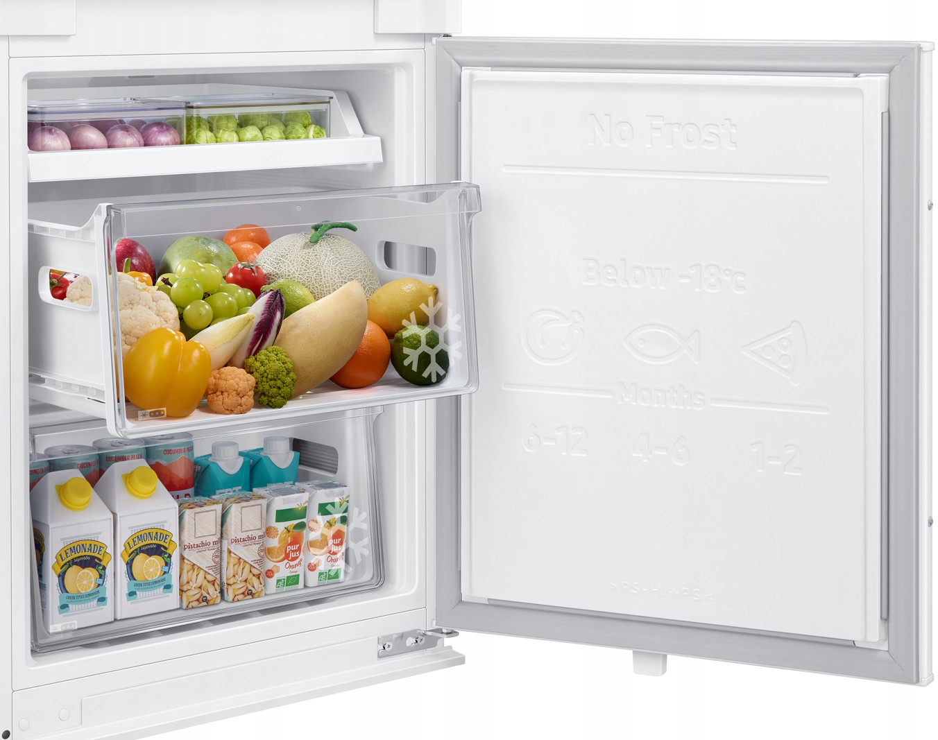 Lodówka Samsung BRB80F30ADS0EO o pojemności 298 litrów to nowoczesne urządzenie do zabudowy, które łączy funkcjonalność z eleganckim designem. Technologia NoFrost eliminuje konieczność rozmrażania, a system Twin Cooling zapewnia optymalne warunki przechowywania żywności dzięki niezależnej cyrkulacji powietrza w chłodziarce i zamrażarce. Delikatne oświetlenie Gentle Lighting równomiernie rozjaśnia wnętrze, ułatwiając dostęp do produktów nawet przy pełnym załadunku.
