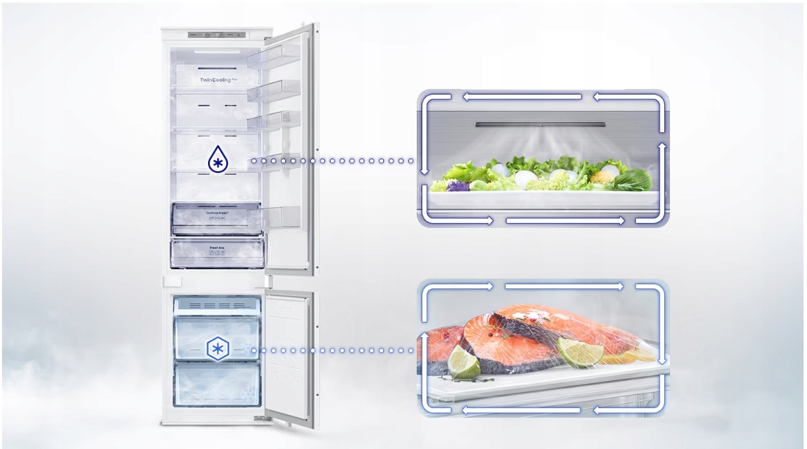 Zastosowanie technologii Twin Cooling™ umożliwia niezależną kontrolę komór chłodziarki i zamrażalnika, optymalizując w nich temperaturę i wilgotność. Twoje jedzenie dłużej pozostaje świeże i zachowuje swój naturalny smak i aromat. System zapobiega również mieszaniu się zapachów.