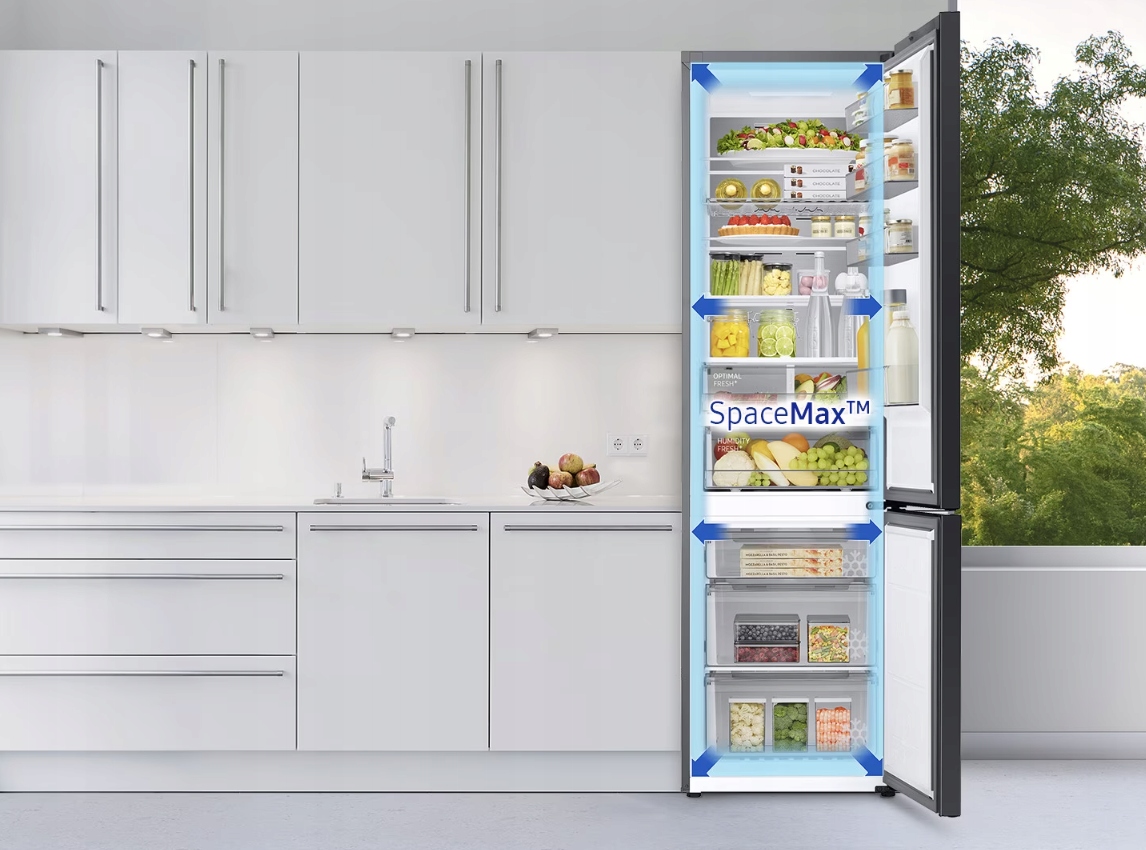 Technologia SpaceMax™ zapewnia większą pojemność lodówki przy takich samych wymiarach zewnętrznych. Dzięki nowemu systemowi wydajnej izolacji ścianki urządzenia są cieńsze, co zapewnia więcej miejsca wewnątrz na produkty spożywcze.