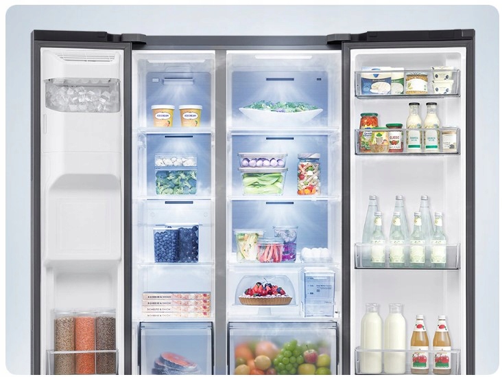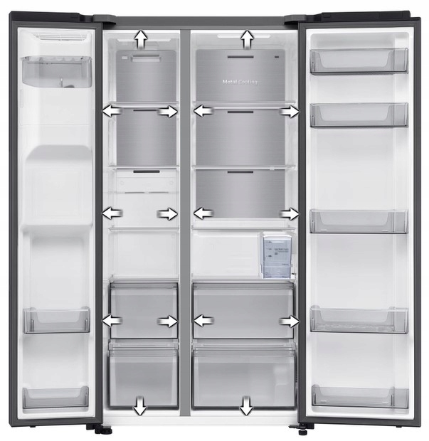 System All-Around Cooling równomiernie chłodzi każdą część lodówki. Zimne powietrze wdmuchiwane jest przez otwory wentylacyjne umieszczone na kilku poziomach, dzięki czemu temperatura wewnątrz jest stabilna, a jedzenie dłużej pozostaje świeże.