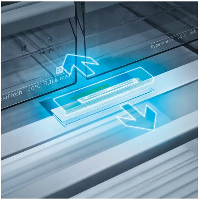 - , 2 szuflady hyperFresh ◄0°C► z regulacją temperatury: ryby i mięso pozostaną dłużej świeże