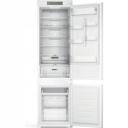 Lodówko-zamrażarka do zabudowy Whirlpool w kolorze białym. Szklane półki zapewniają wytrzymałość i elegancję. Wentylator zapewnia płynny i równomierny przepływ powietrza we wnętrzu urządzenia w celu udoskonalonej wentylacji. Czujniki 6-ty Zmysł automatycznie obniżają temperaturę w lodówce po włożeniu nowych produktów, zmniejszając zużycie energii.