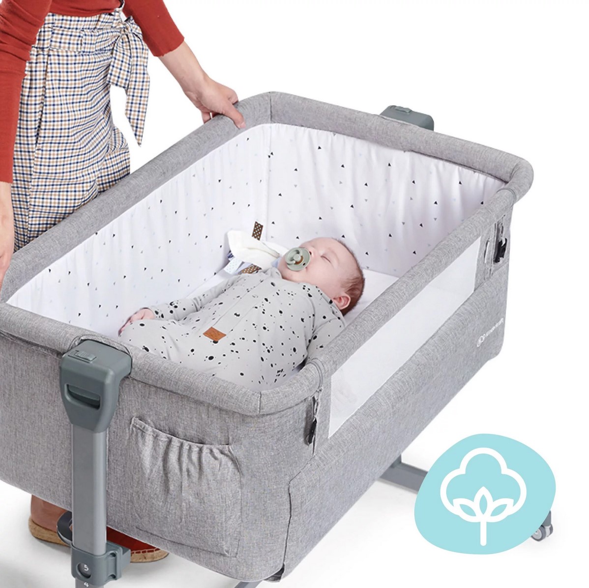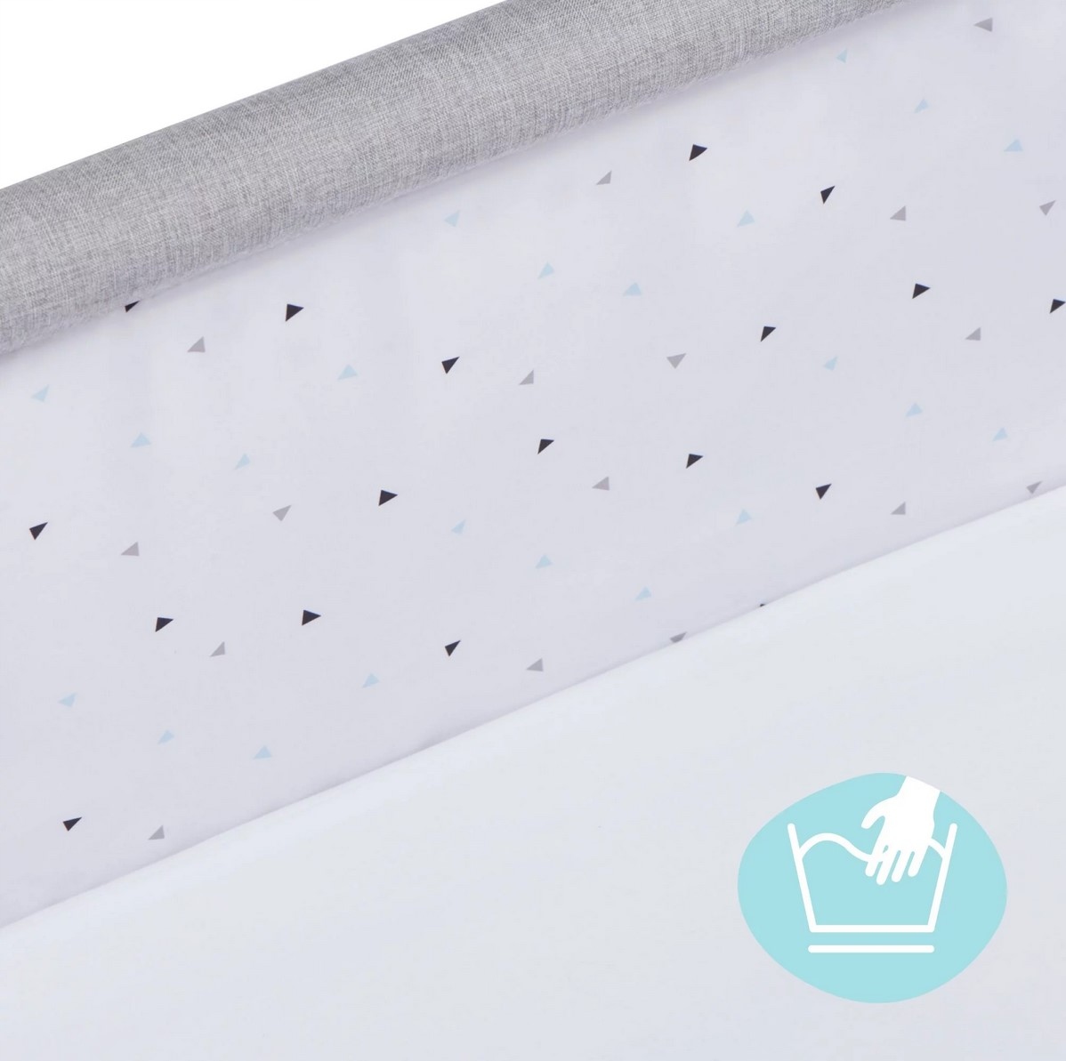 Łóżeczko ma przyjemny i łatwy do utrzymania w czystości materiał w ciekawy wzór. Modne kolory pasują do większości wnętrz w przeróżnych stylach. Pokrowiec łóżeczka można prać w pralce.