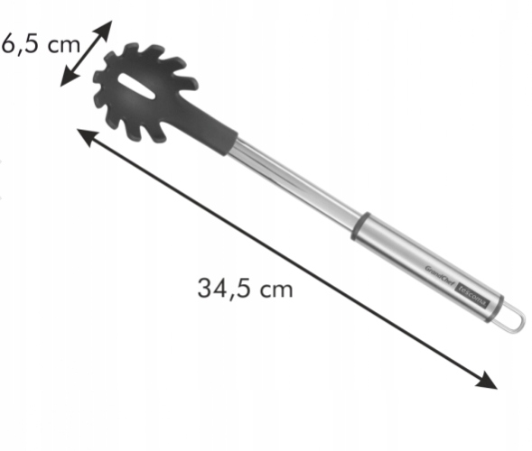 Łyżka do spaghetti GrandCHEF+ wykonana ze stali nierdzewnej i żaroodpornego nylonu. Możliwość mycia w zmywarce.