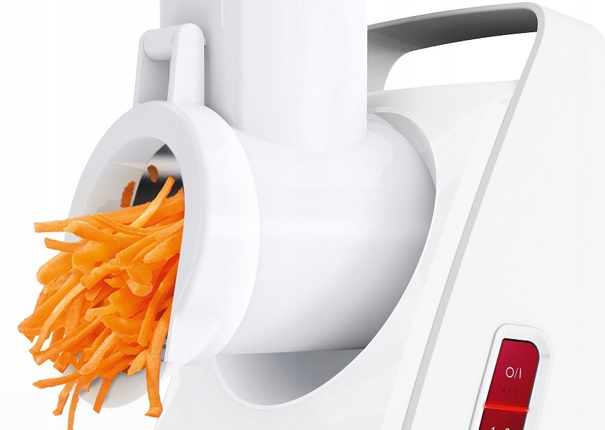 - Wyposażenie: Dwustronny nożyk, Sito o średnicy oczek: 4 mm, Szatkownica z 3 bębnami tnącymi