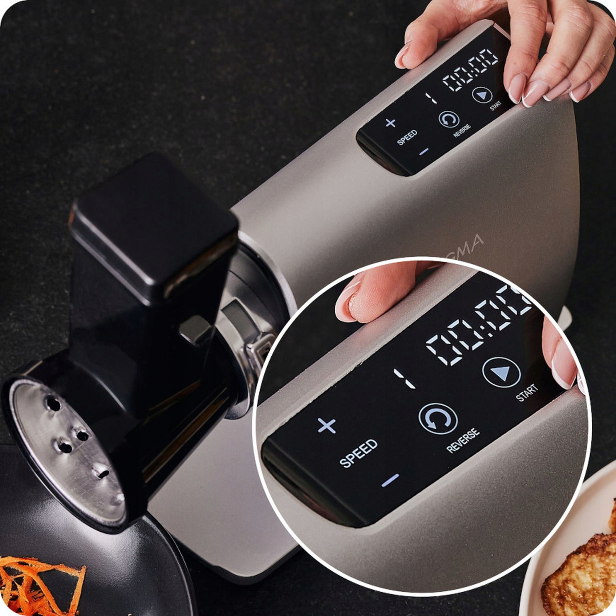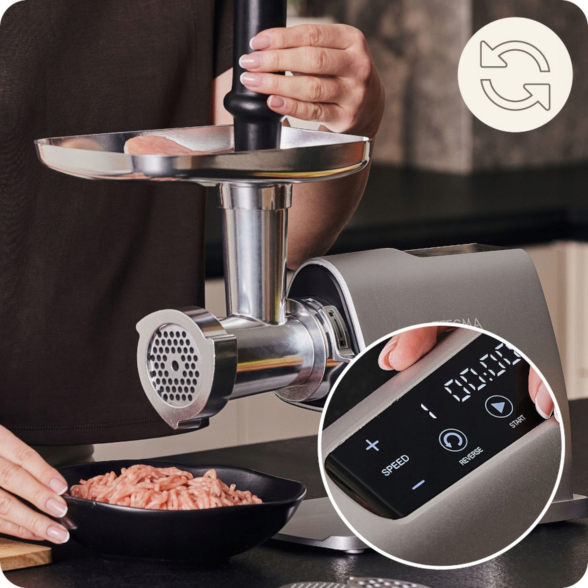 Nowoczesny panel dotykowy z wyświetlaczem LED umieszczony na górze maszynki to prawdziwa rewolucja, jeśli chodzi o łatwość obsługi urządzenia. Dzięki intuicyjnemu sterowaniu masz pełną kontrolę nad regulacją prędkości, uruchamianiem urządzenia i biegu wstecznego. Natomiast czytelny wyświetlacz wskazuje czas mielenia.