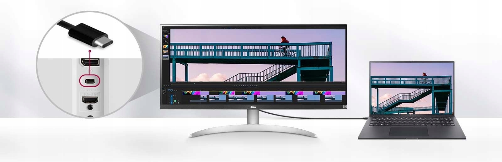 Nowoczesny monitor LG 29WQ600 ma port USB Type-C™ obsługujący DisplayPort Alt Mode. Za pomocą jednego kabla USB Type-C™ można przesyłać sygnał DisplayPort do zewnętrznego monitora bez użycia specjalnych kabli lub aktywnych przejściówek.