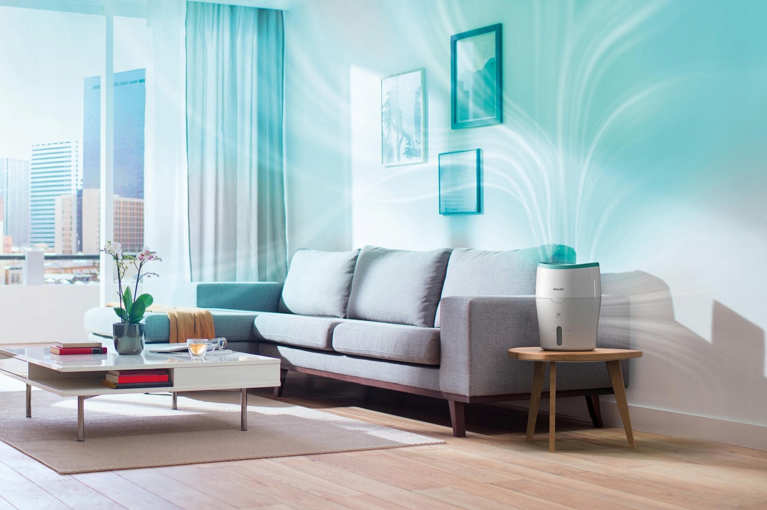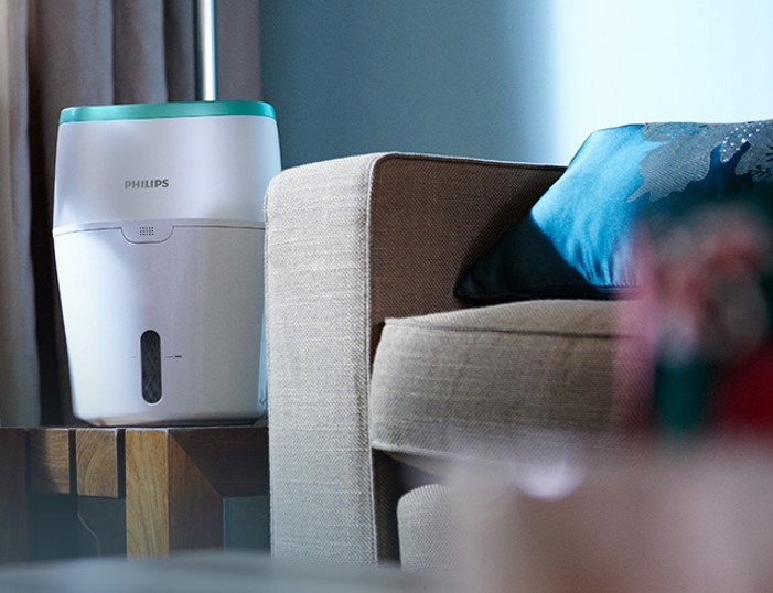 Woda zawiera minerały, wapno i magnez, a gdy jej krople osiadają na meblach, ścianach i podłogach, może powstawać biały osad. Technologia Philips skutecznie temu zapobiega. Bardzo drobna, niewidoczna mgiełka jest zbyt mała, aby przenosić minerały. Dodatkowo cząsteczki mgiełki są lekkie i pozostają na dłużej zawieszone w powietrzu i równomiernie nawilżąją powietrza, nie tworząc mokrych plam wokół urządzenia.