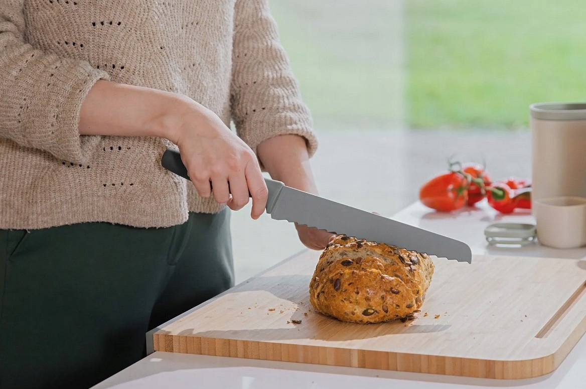 Krojenie chrupiącego chleba lub delikatnego pomidora jest dziecinnie proste z pomocą tego noża z kolekcji Leo. Lekki nóż z miękką w dotyku rękojeścią jest przyjemny w użyciu i sprawia, że ukroisz nim najcieńsze plastry. Ząbkowane ostrze ze stali nierdzewnej z nieprzywierającą powłoką pokroi wszelkie wypieki oraz przebije się przez twardą skórkę warzyw i owoców, nie zgniatając ich delikatnego wnętrza.